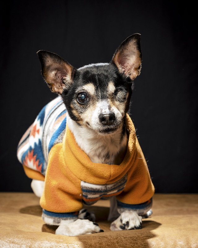 When I arrived the next day, everything went as planned. I set up a small studio in a corner of the downstairs area, and we got full family portraits, all four dogs together, and individual photos showing their unique personalities (and sweaters!). Jacks and all were in good moods and enjoyed the attention and hot dog treats.